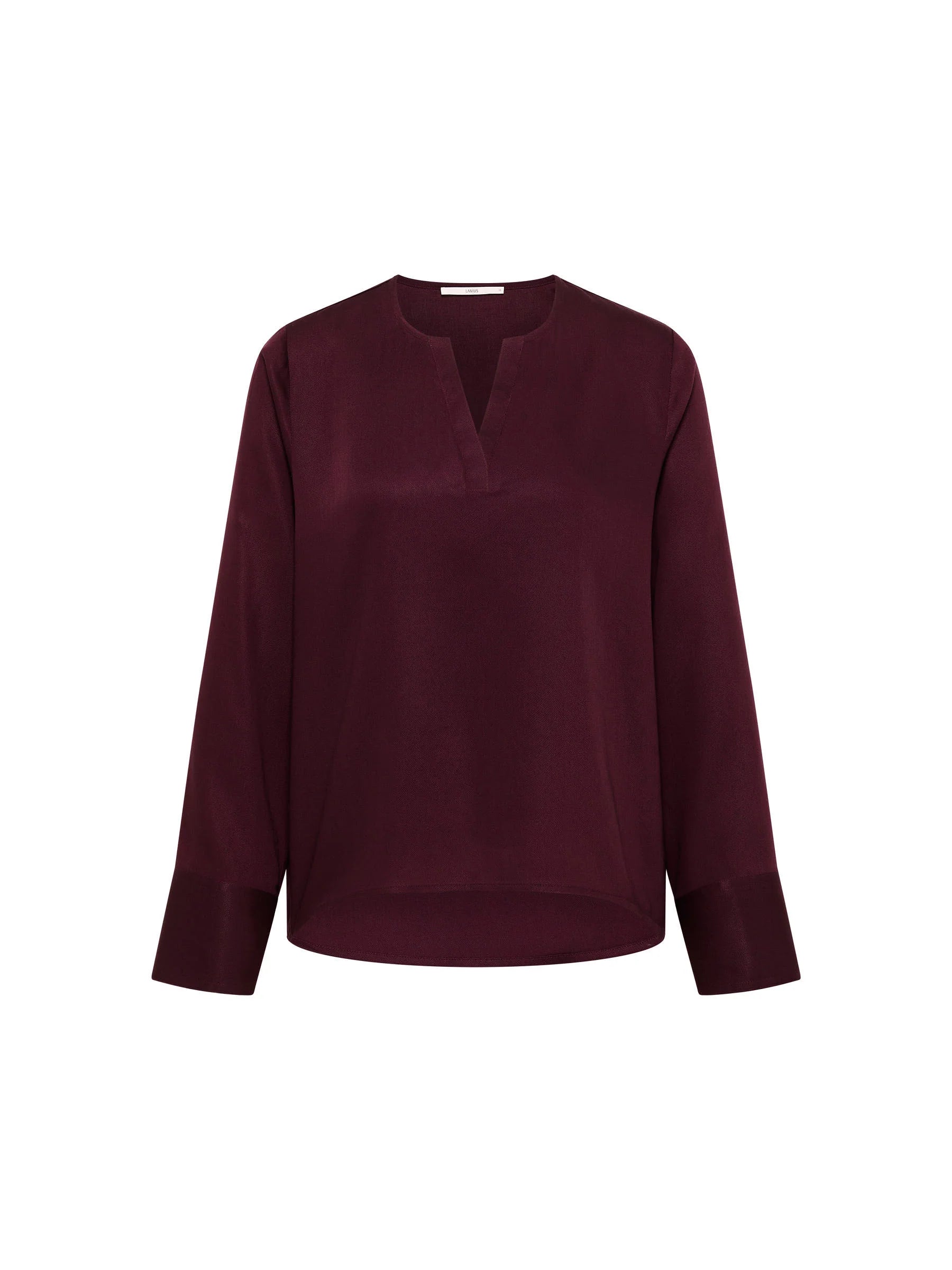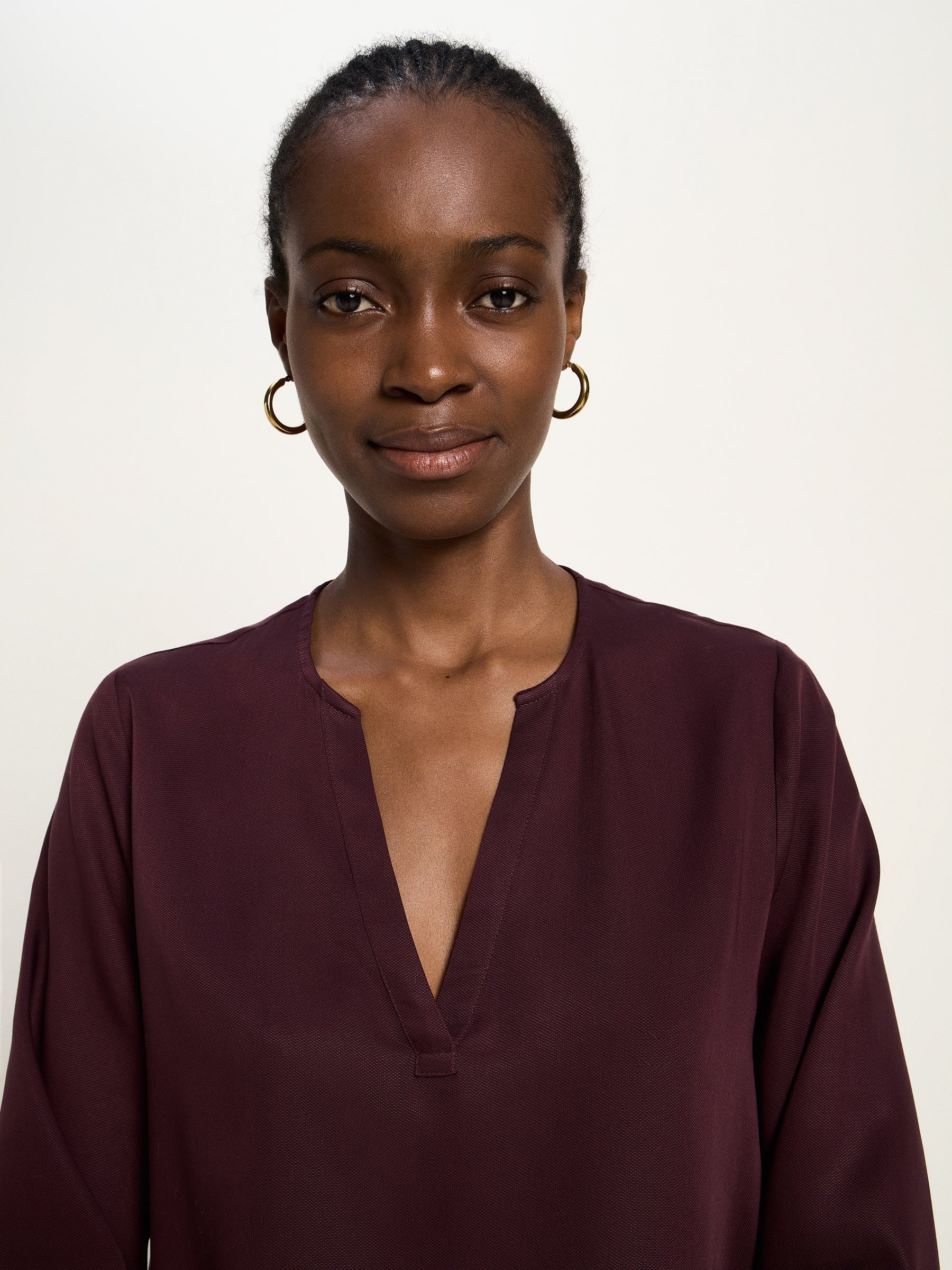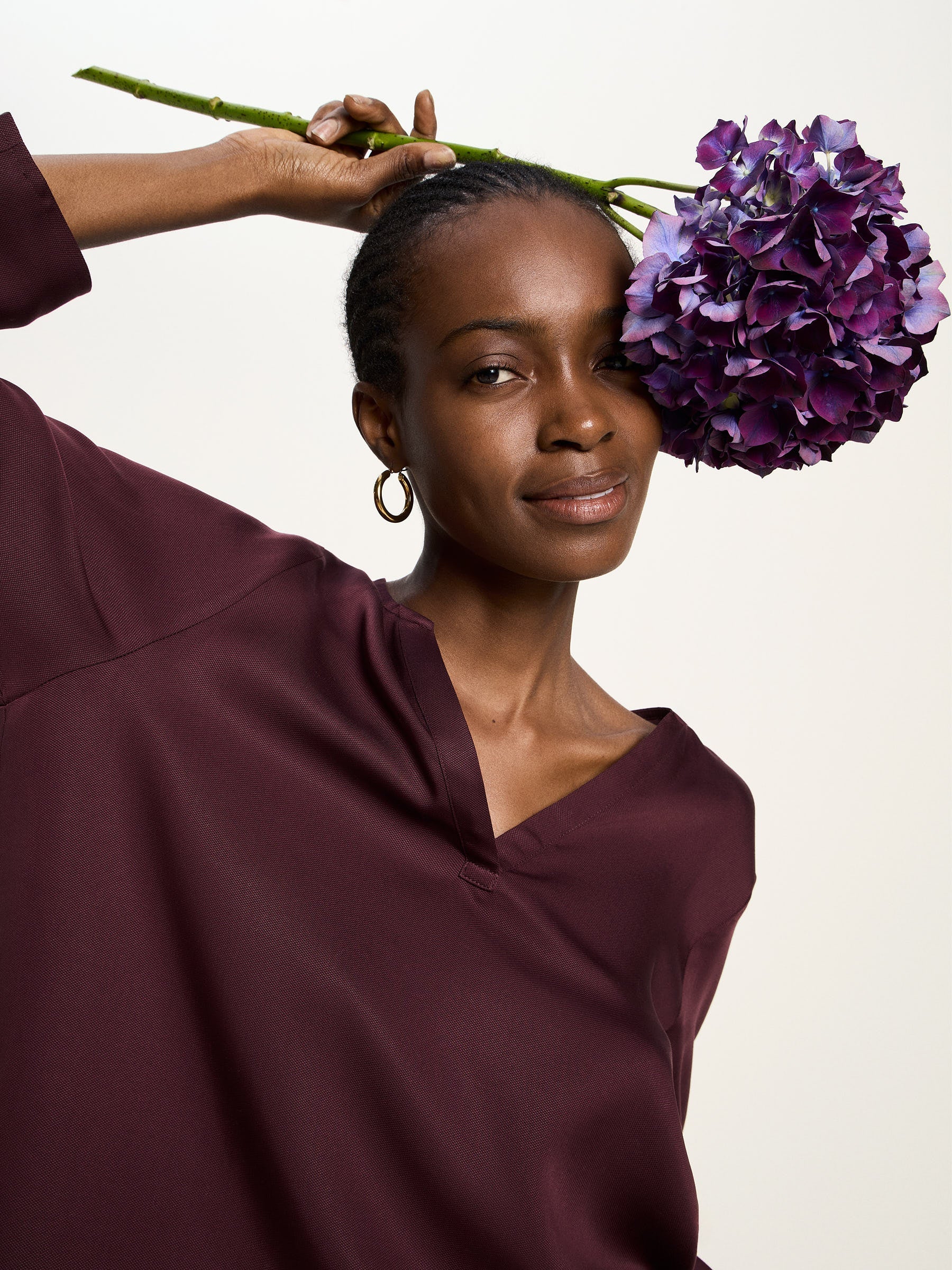 Schlicht, weich und mit natürlichem Glanz: Diese Bluse aus TENCEL™ Lyocell überzeugt durch ihren glatten Griff, fließenden Fall und zeitlos elegantes Design. Der V-Ausschnitt mit angesetztem Kragenelement und der gerade, minimalistische Schnitt machen sie zu einem vielseitigen Essential für Alltag und Büro. Die weiche Lyocell-Qualität trägt sich angenehm leicht auf der Haut – vegan gefertigt und ideal kombinierbar mit Denim, feinen Stoffhosen oder als eleganter Kontrast zu Strick.