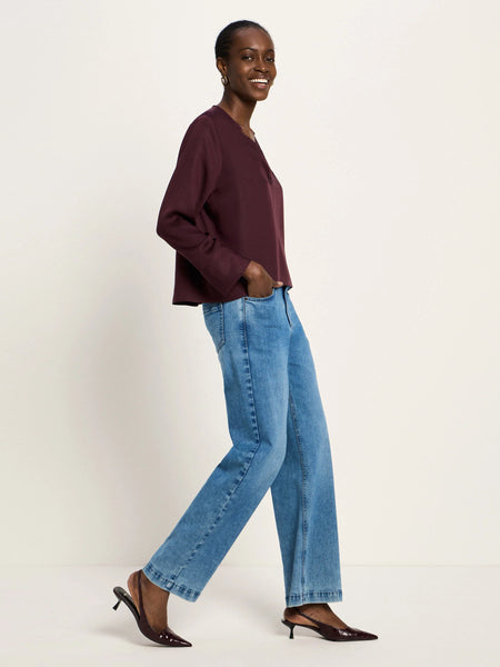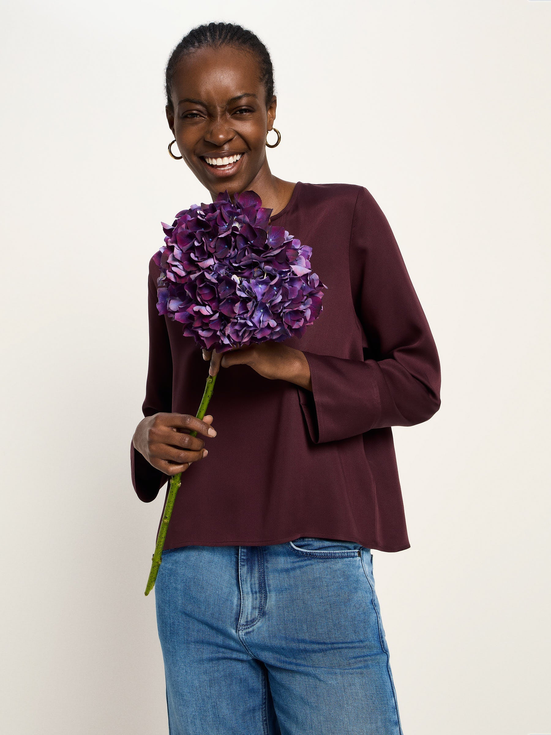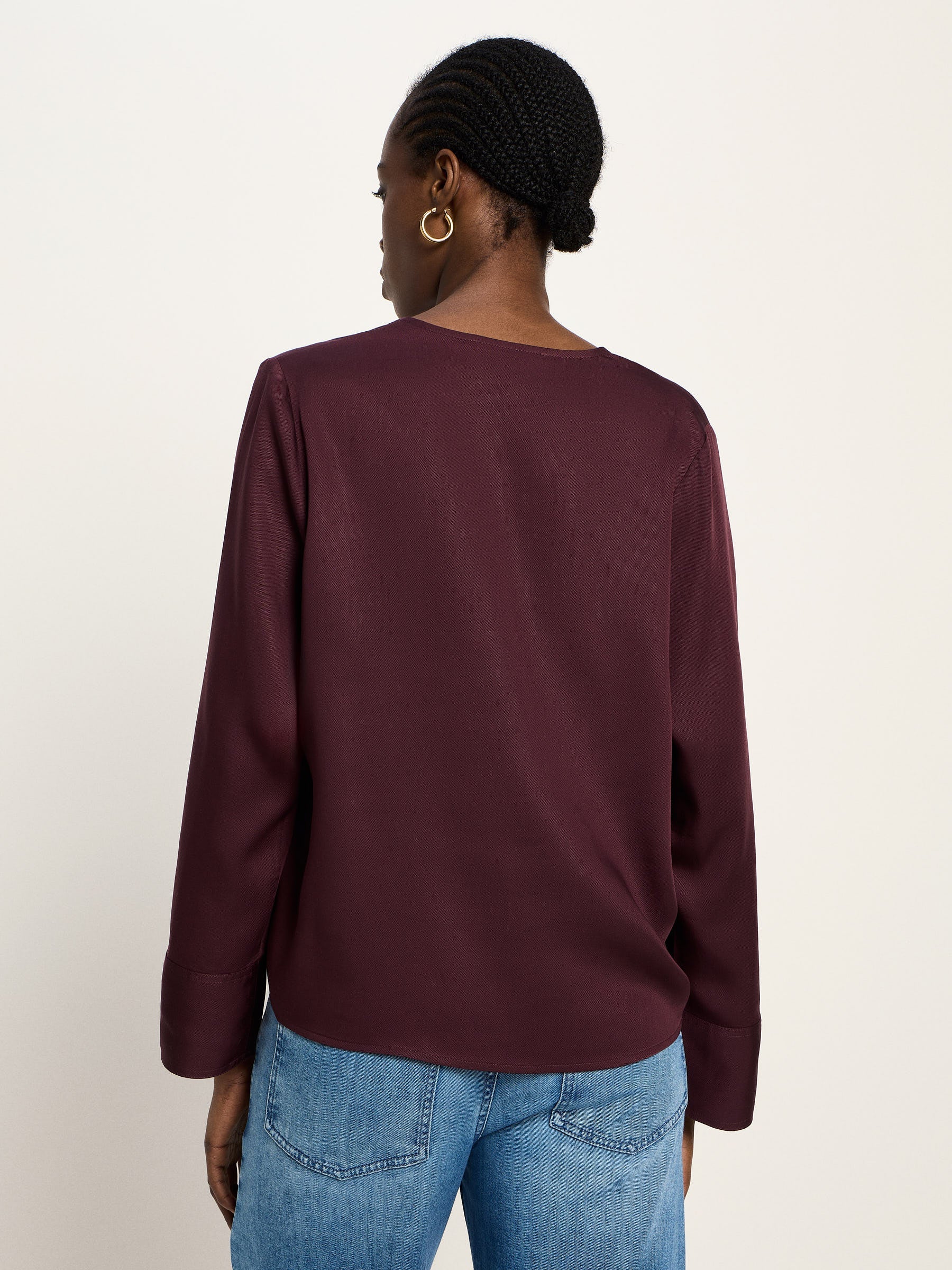 Schlicht, weich und mit natürlichem Glanz: Diese Bluse aus TENCEL™ Lyocell überzeugt durch ihren glatten Griff, fließenden Fall und zeitlos elegantes Design. Der V-Ausschnitt mit angesetztem Kragenelement und der gerade, minimalistische Schnitt machen sie zu einem vielseitigen Essential für Alltag und Büro. Die weiche Lyocell-Qualität trägt sich angenehm leicht auf der Haut – vegan gefertigt und ideal kombinierbar mit Denim, feinen Stoffhosen oder als eleganter Kontrast zu Strick.