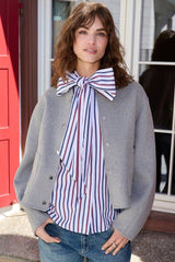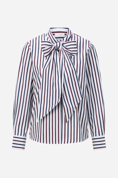 Diese Bluse mit Schleifenkragen bringt feminine Raffinesse in Deinen Look: Der lockere Fit, das moderne Streifenmuster in Navy, Offwhite und Bordeaux sowie klassische Details machen sie zum stilvollen Allrounder fürs Büro und Deine Everyday-Outfits.