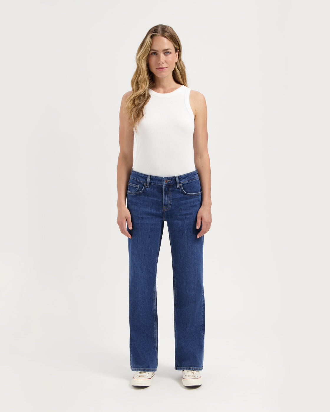 Die Lena ist unsere Mid-Rise Regular Straight-Leg Jeans. Diese Damenjeans bietet einen entspannten, jungenhaften Look mit einem Vintage-Vibe.