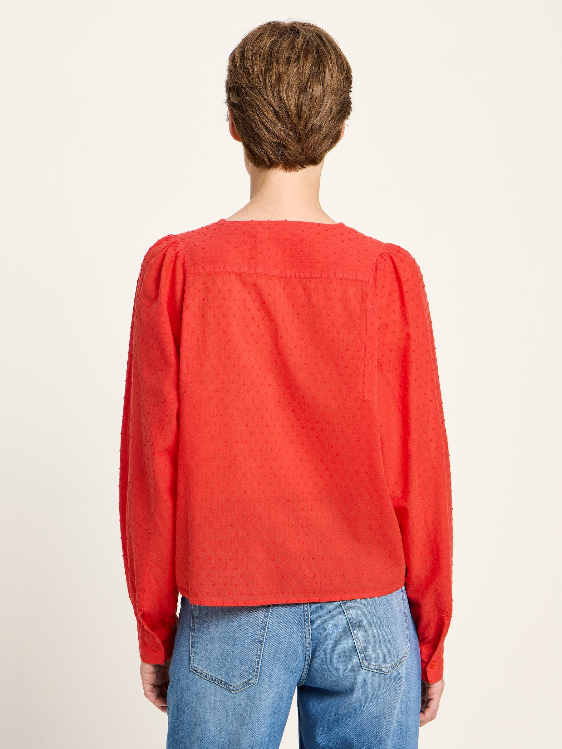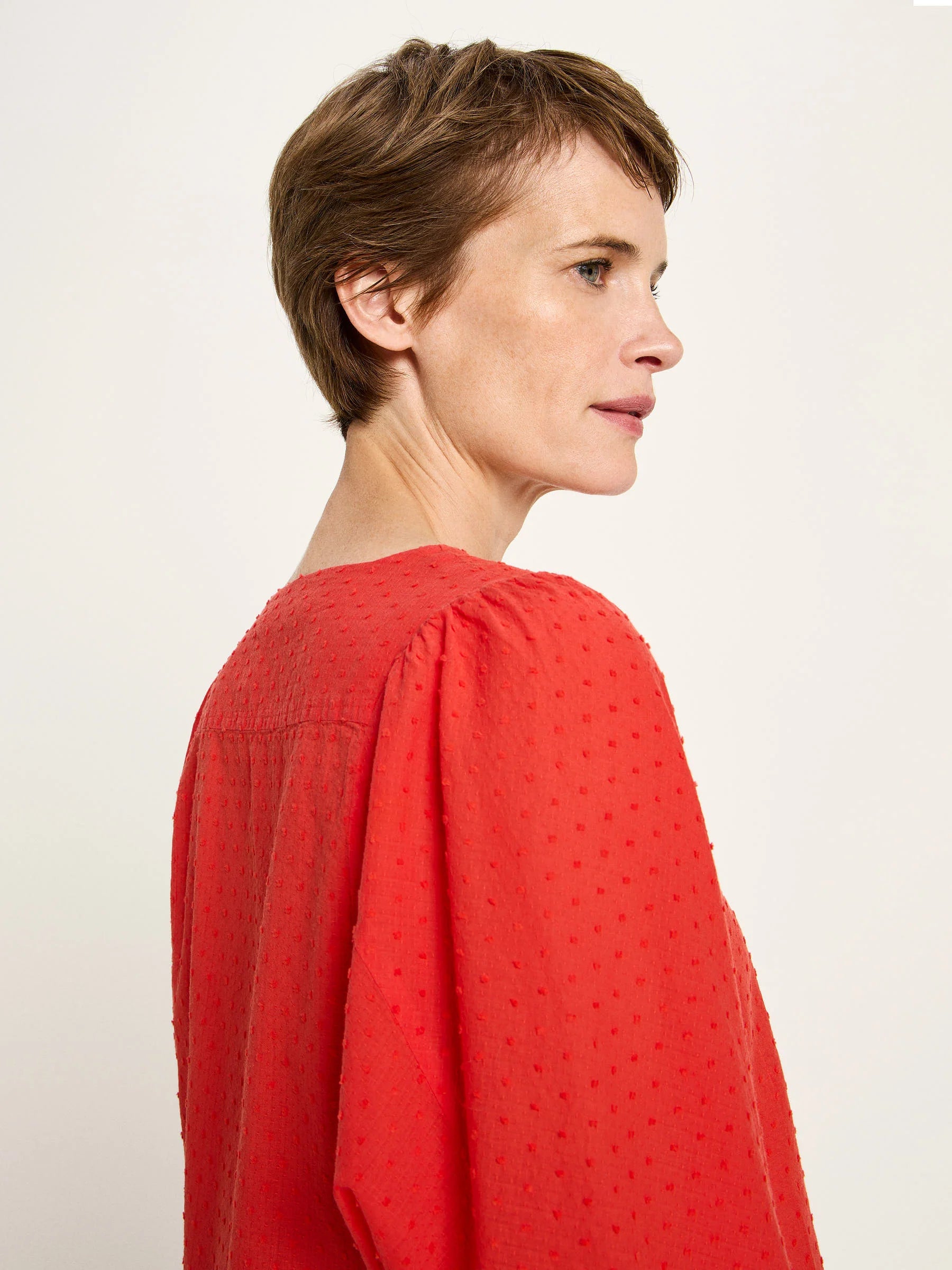 Die Strukturbluse aus veganer Bio-Baumwolle bringt durch die Ton-in-Ton-Noppen und zarte Kräuseldetails feminine Leichtigkeit in den Alltag. Der weite, fließende Schnitt trifft auf weich geraffte Schultern und Ärmel, ein dezenter V-Ausschnitt rundet den modernen Look ab. Die leicht transparente Baumwollqualität wirkt edel – ideal für bewusste Outfits mit besonderer Struktur, ob zur Jeans, zur Culotte oder unter feinem Strick.