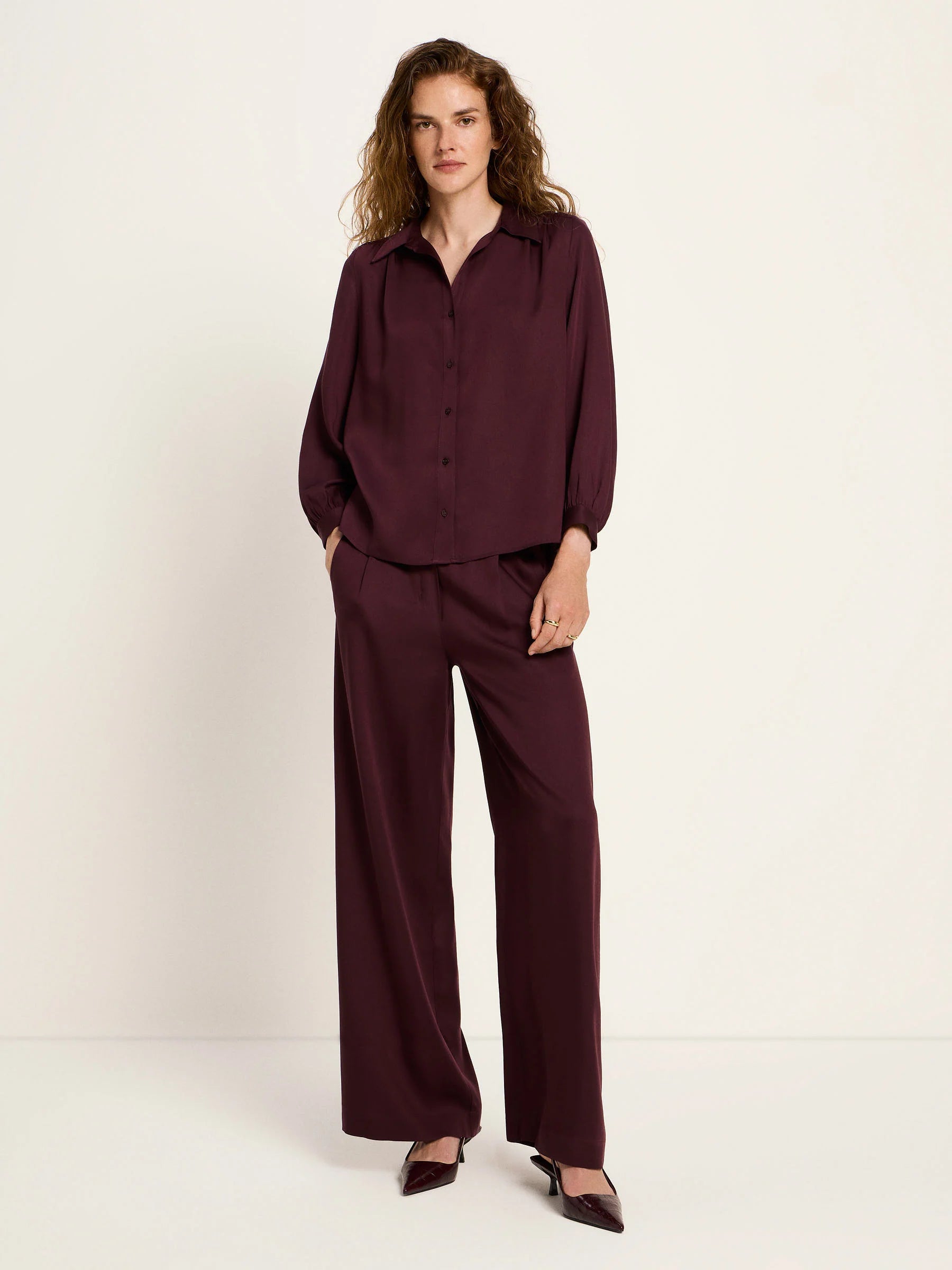 Die Hemdbluse aus glattem TENCEL™ Lyocell überzeugt mit fließendem Fall, natürlichem Glanz und einem angenehm leichten Tragegefühl. Der klassische Hemdkragen, die durchgehende Knopfleiste und die dezent gerafften Manschettenärmel verleihen dem Modell zeitlose Eleganz. Der leicht abgerundete Saum macht die Bluse sowohl zum Einstecken als auch zum lockeren Tragen geeignet.