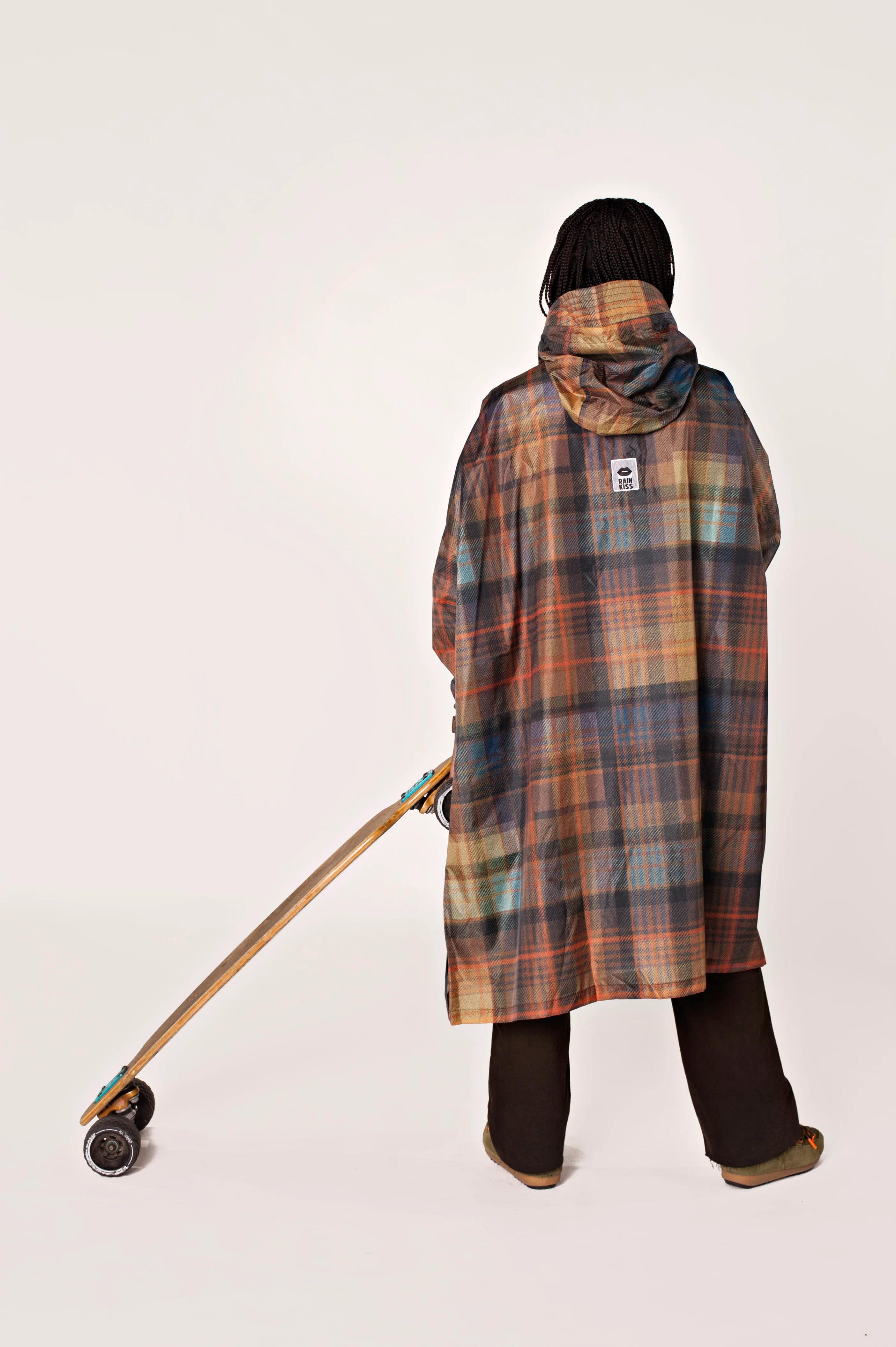 Von den sanften Hügeln Schottlands bis zum Trubel der Stadt... Der Tartan-Regenponcho wird nie aus der Mode kommen. Mit goldenen Braun-, Blau- und leuchtenden Orangetönen erhält dieser ikonische Druck einen Hauch von modernem Flare.