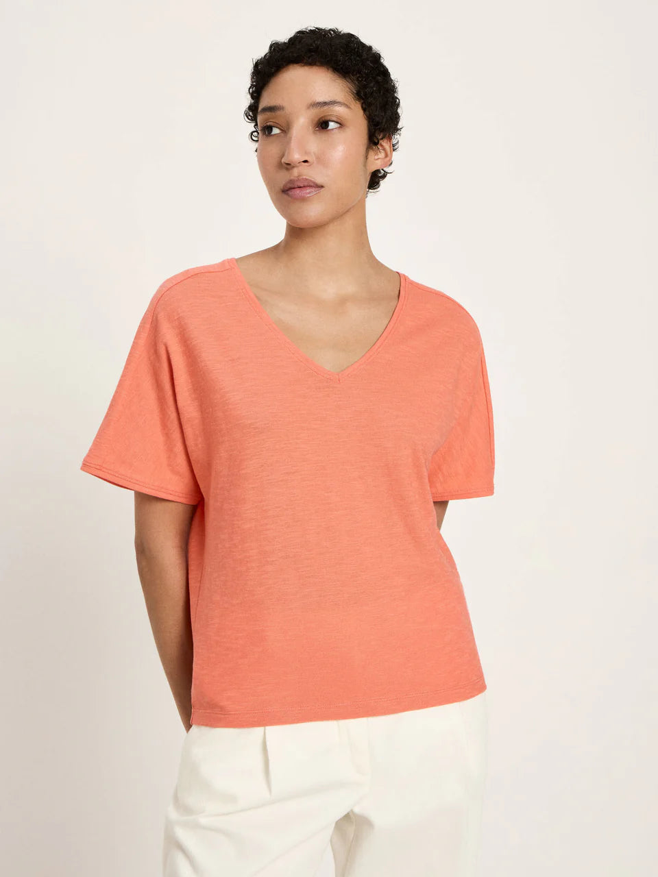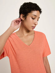Locker & Casual! Das leicht fließende Shirt aus Bio-Baumwolle bietet angenehmen Tragekomfort. Durch seine lockere Passform, den V-Ausschnitt und die weiten Ärmel wirkt das Shirt besonders lässig. Vegan produziert und GOTS-zertifiziert ist das Kurzarmshirt ein echtes Lieblingsshirt. Eine Leichtigkeit, die begeistert!